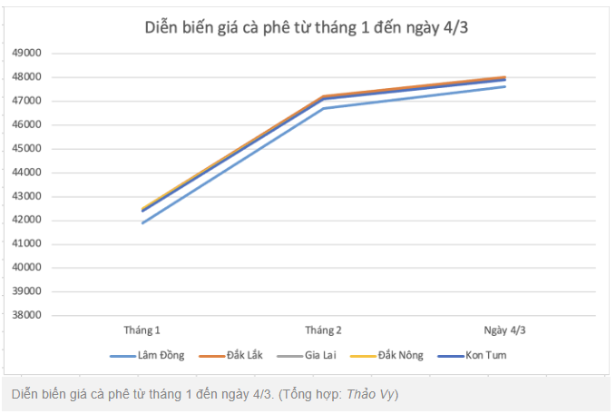Giá cà phê hôm nay (4/3) giảm 300 đồng/kg so với hôm qua, hiện xuống khoảng 47.600 - 48.000 đồng/kg. Trên Sàn New York, giá cà phê arabica giao tháng 5/2023 giảm hơn 2% trong phiên sáng nay.