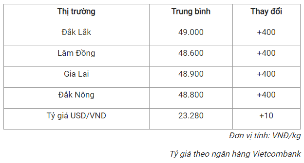 Ghi nhận cho thấy, các địa phương đang thu mua cà phê với giá trong khoảng 48.600 - 49.000 đồng/kg.