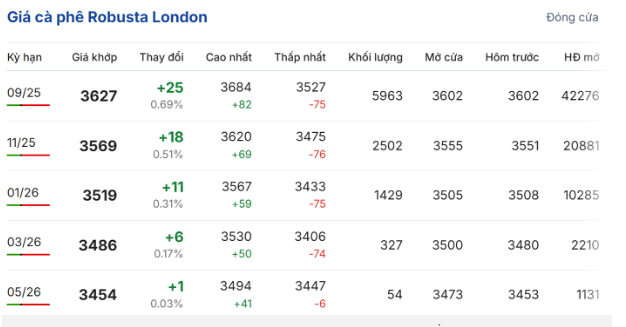 Trong phiên giao dịch kết thúc vào sáng ngày 4/7, giá cà phê trực tuyến robusta hợp đồng giao kỳ hạn tháng 9/2025 trên sàn giao dịch London đóng cửa ở mức 3.627 USD/tấn, tăng 0,69% (25 USD/tấn) so với ngày hôm trước; hợp đồng giao kỳ hạn tháng 11/2025 tăng 0,51% (18 USD/tấn), lên mức 3.569 USD/tấn.