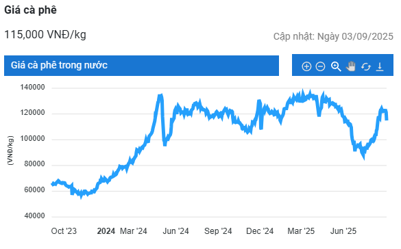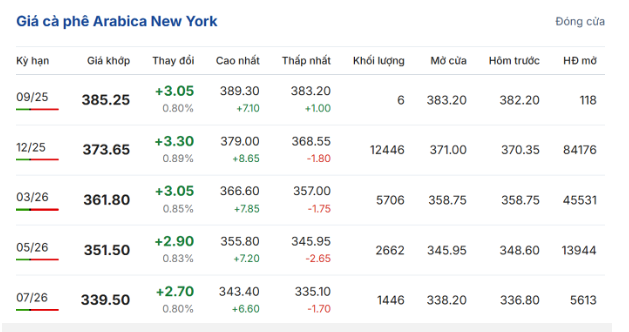 Trên sàn giao dịch New York, giá cà phê arabica giao kỳ hạn tháng 9/2025 cũng tăng nhẹ 0,8% (3,,05 US cent/pound) so với phiên giao dịch trước, đạt 385,25 US cent/pound. Hợp đồng giao kỳ hạn tháng 12/2025 tăng 0,89% (3,3 US cent/pound), đạt 373,65 US cent/pound.