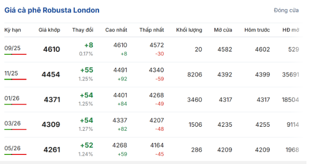 Kết thúc phiên giao dịch ngày 3/9, trên sàn giao dịch London, giá cà phê trực tuyến robusta hợp đồng giao kỳ hạn tháng 9/2025 đạt 4.610 USD/tấn, đảo chiều tăng nhẹ 0,17% (8 USD/tấn) so với phiên giao dịch trước. Hợp đồng giao kỳ hạn tháng 11/2025 tăng mạnh hơn, với mức tăng 1,25% (55 USD/tấn), đạt 4.454 USD/tấn.
