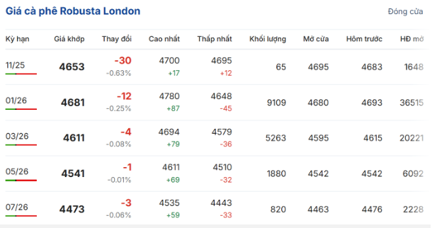 Đóng cửa phiên giao dịch ngày 4/11, giá cà phê trực tuyến robusta hợp đồng giao kỳ hạn tháng 11/2025 trên sàn London quay đầu giảm 0,63% (30 USD/tấn) so với phiên giao dịch trước, xuống còn 4.6853 USD/tấn. Hợp đồng giao kỳ hạn tháng 1/2026 giảm 0,25% (12 USD/tấn), đạt 4.681 USD/tấn.