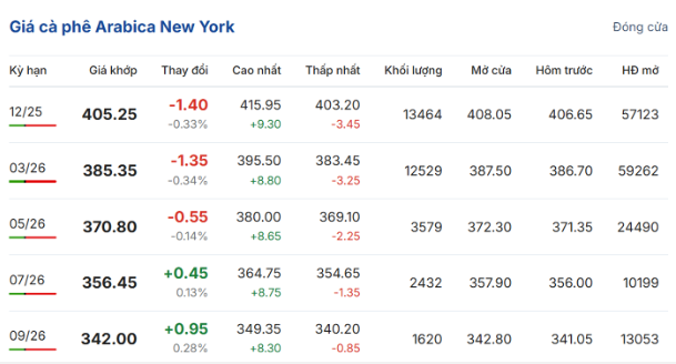 Trên sàn giao dịch New York, giá cà phê arabica giao kỳ hạn tháng 12/2025 cũng giảm 0,33% (1,4 US cent/pound) so với ngày hôm trước, đạt 405,25 US cent/pound. Hợp đồng giao tháng 3/2026 giảm 0,34% (1,35 US cent/pound), đạt 385,35 US cent/pound.