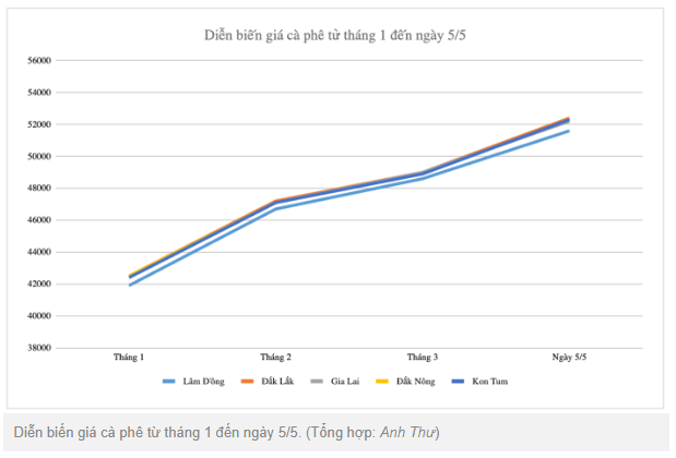Giá cà phê hôm nay (5/5) tại thị trường trong nước giảm 200 đồng/kg. Theo đó, mức giao dịch thấp nhất trong các địa phương được khảo sát là 51.600 đồng/kg, được ghi nhận tại tỉnh Lâm Đồng.