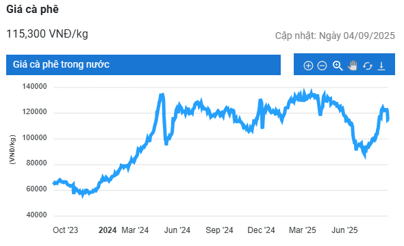 Trên sàn giao dịch London, giá cà phê trực tuyến robusta hợp đồng giao kỳ hạn tháng 9/2025 đóng cửa phiên giao dịch ngày 4/9 ở mức 4.581 USD/tấn, giảm 0,63% (29 USD/tấn) so với phiên giao dịch trước. Hợp đồng giao kỳ hạn tháng 11/2025 giảm 0,9% (40 USD/tấn), đạt 4.414 USD/tấn.