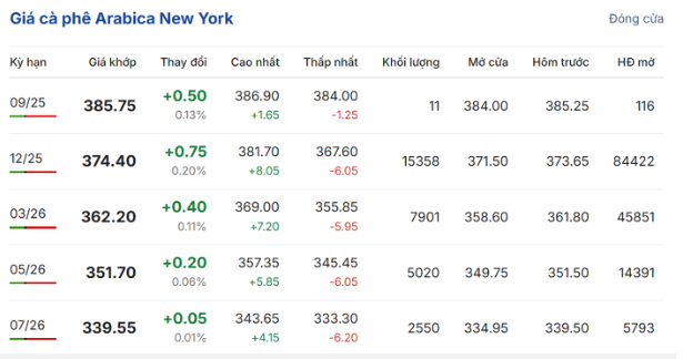 Ngược lại, trên sàn giao dịch New York, giá cà phê arabica giao kỳ hạn tháng 9/2025 tiếp tục tăng nhẹ 0,13% (0,5 US cent/pound) so với phiên giao dịch trước, lên mức 385,75 US cent/pound. Hợp đồng giao kỳ hạn tháng 12/2025 tăng 0,2% (0,75 US cent/pound), đạt 374,4 US cent/pound.