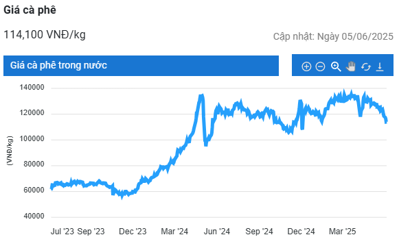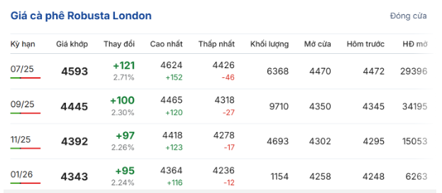 Trong phiên giao dịch kết thúc sáng ngày 6/6, giá cà phê trực tuyến robusta hợp đồng giao tháng 7/2025 trên Sàn giao dịch London đứng mức 4.593 USD/tấn, tăng 2,71% (121 USD/tấn) so với phiên giao dịch trước; hợp đồng giao kỳ hạn tháng 9 tăng 2,3% (100 USD/tấn), đạt 4.445 USD/tấn.