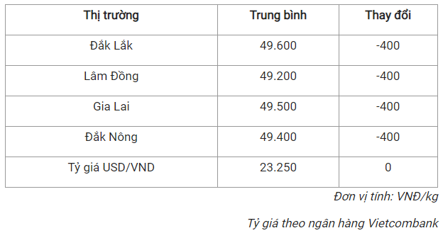 Ghi nhận cho thấy, các địa phương đang thu mua cà phê với giá trong khoảng 49.200 - 48.600 đồng/kg.