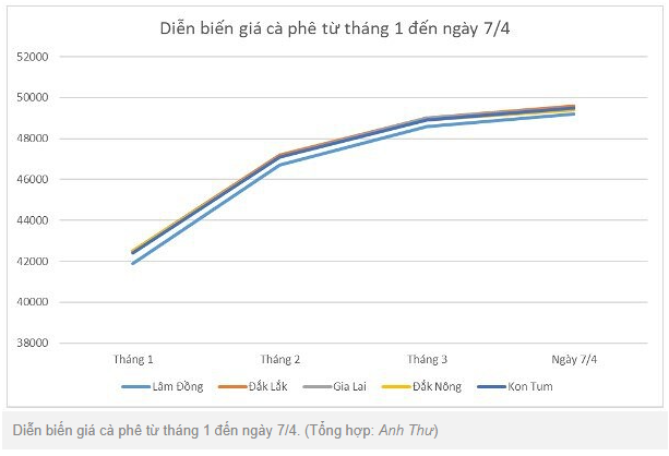 Trong đó, tỉnh Lâm Đồng có mức giá thấp nhất là 49.200 đồng/kg. Kế đến là Đắk Nông với 49.400 đồng/kg.
