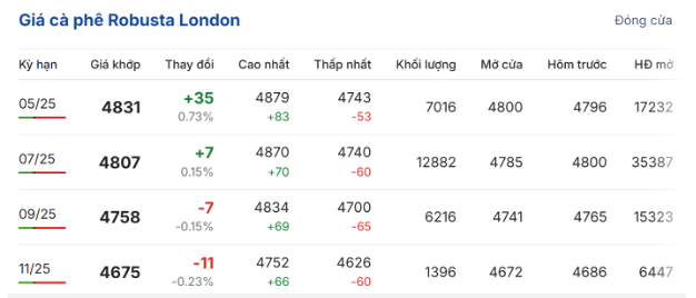 Trên Sàn giao dịch London, giá cà phê trực tuyến robusta hợp đồng giao tháng 5/2025 chốt phiên giao dịch sáng 9/4 ở mức 4.831 USD/tấn, tăng nhẹ 0,73% (35 USD/tấn) so với phiên giao dịch trước; hợp đồng giao tháng 7/2025 tăng 0,15% (7 USD/tấn), lên mức 4.807 USD/tấn.