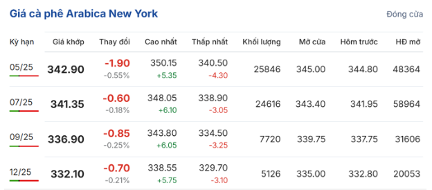 Ngược lại, trên Sàn giao dịch New York, giá cà phê arabica giao tháng 5/2025 giảm nhẹ 0,55% (1,9 US cent/pound), về mốc 342,9 US cent/pound; hợp đồng giao kỳ hạn tháng 7/2025 giảm 0,18% (0,6 US cent/pound), đạt 341,35 US cent/pound.