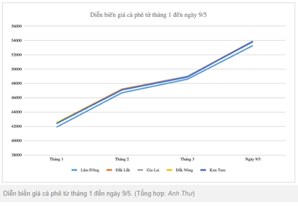 Giá cà phê hôm nay (9/5) tại thị trường trong nước ổn định. Hiện, giá thu mua cao nhất trong các địa phương được khảo sát được duy trì ở mức 53.900 đồng/kg.