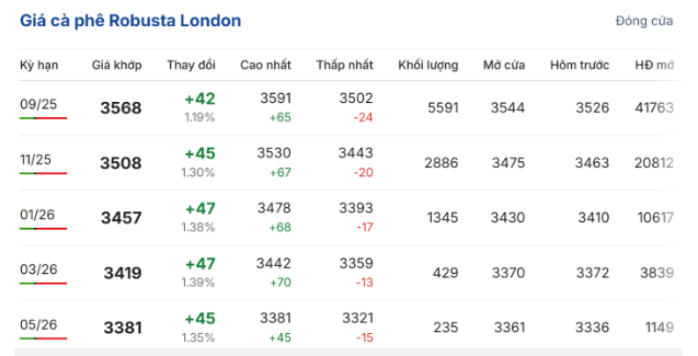 Trên sàn giao dịch London, giá cà phê trực tuyến robusta hợp đồng giao kỳ hạn tháng 9/2025 đóng cửa phiên giao dịch sáng nay 9/7 ở mức 3.568 USD/tấn, tăng 1,19% (42 USD/tấn) so với phiên giao dịch trước; hợp đồng giao kỳ hạn tháng 11/2025 tăng 1,3% (45 USD/tấn), lên mức 3.508 USD/tấn.