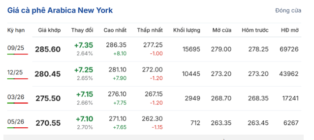 Tương tự, trên sàn giao dịch New York, giá cà phê arabica giao kỳ hạn tháng 9/2025 tăng 2,64% (7,35 US cent/pound), lên 285,6 US cent/pound; hợp đồng giao kỳ hạn tháng 11/2025 tăng 2,65% (7,25 US cent/pound), đạt 280,45 US cent/pound.