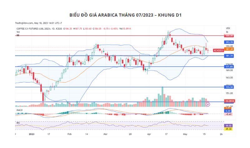 Về mặt kỹ thuật, các chỉ báo cho tín hiệu trung tính trên khung D1. Đường MACD giao với đường Signal, đi ngang theo mức 0, giá dao động quanh đường trung bình động MA20 của dải Bollinger Bands thắt chặt. Như vậy, giá Arabica khả năng cao tiếp tục giằng co trước khi có số liệu từ báo cáo của Conab.