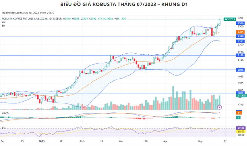 Đường RSI tiến vào vùng quá mua tại mức 72,82%, cùng giá đã vượt khỏi cạnh trên của dải Bollinger Bands. Như vậy, giá Robusta có thể rung lắc quanh 2.580 USD/tấn trước khi phản ứng với số liệu từ báo cáo của Conab.