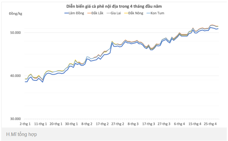 Ở thị trường nội địa, giá cà phê cũng tăng theo đà của thế giới. Tính đến ngày 29/4, giá cà phê thiết lập kỷ lục mới khi vượt ngưỡng 51.000 đồng/kg. Trước đó, kỷ lục cũ là 50.800 được ghi nhận hồi tháng 8/2022.