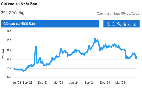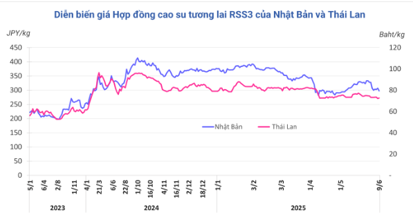 Kết thúc phiên giao dịch 9/6, giá cao su kỳ hạn tháng 6 trên Sàn OSE ở Nhật Bản giảm 3% (9,2 yen) về mức 297,6 yen/kg. Ở Trung Quốc, giá cao su trên Sàn Thượng Hải (SHFE) giảm 0,7% (100 nhân dân tệ) xuống mức 13.500 nhân dân tệ/tấn. Tại Thái Lan, giá cao su kỳ hạn tháng 6 tăng 0,6% (0,46 baht) lên mức 72,6 baht/kg.