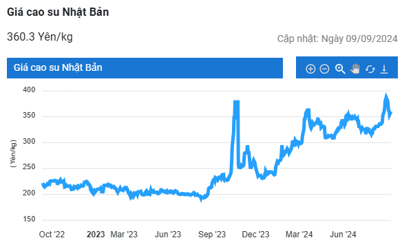 Cập nhật đến sáng ngày 10/9, giá cao su RSS 3 tại sở hàng hoá Tokyo (TOCOM) – Nhật Bản tăng thêm 1,6% so với ngày giao dịch trước, lên mức 365,9 yen/kg đối với hợp đồng giao tháng 9; hợp đồng giao tháng 1/2025 tăng 1,4%, lên 361,4 yen/kg.