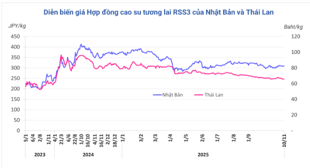 Kết thúc phiên giao dịch 10/11, tại Thái Lan, giá cao su kỳ hạn tháng 12/2025 giảm nhẹ 0,1% (0,04 baht) về mức 65,76 baht/kg. Tại thị trường Nhật Bản (OSE), giá cao su kỳ hạn tháng 12 tăng 0,6% (2 yen) lên mức 310 yen/kg. Tại Trung Quốc, giá cao su kỳ hạn tháng 1/2026 tăng 0,13% (20 nhân dân tệ) lên mức 15.045 nhân dân tệ/tấn.