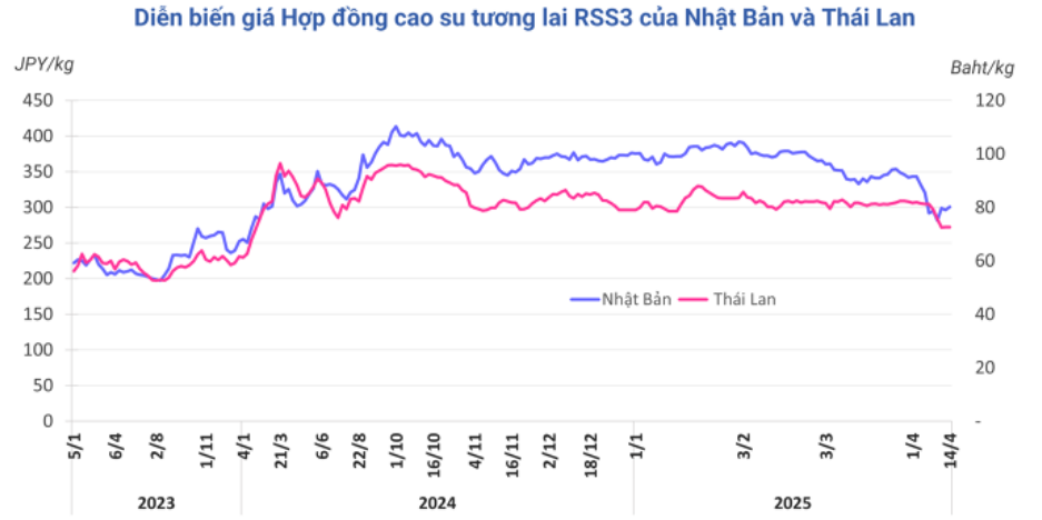 Kết thúc phiên giao dịch 14/4, tại Nhật Bản, giá cao su kỳ hạn tháng 4 tăng 1,3% (4 yên) lên mức 300,5 yen/kg. Ở Trung Quốc, giá cao su tiếp tục tăng 2,1% (310 nhân dân tệ) lên mức 15.010 nhân dân tệ/tấn; trong khi tại Thái Lan, giá cao su kỳ hạn tháng 5 đi ngang mức 72,63 baht/kg khi hôm qua trùng vào ngày Tết Songkran, ngày Lễ sẽ kéo dài tới hết hôm nay.