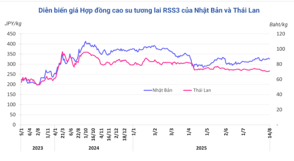 Kết thúc phiên giao dịch 14/8, tại Trung Quốc, giá cao su kỳ hạn tháng 9 trên Sàn Thượng Hải (SHFE) đảo chiều giảm 0,6% (85 nhân dân tệ) về mức 14.765 nhân dân tệ/tấn. Tại Thái Lan, giá cao su kỳ hạn tháng 8 bất ngờ tăng 1% (0,74 baht) lên mức 71,22 baht/kg. Tương tự, thị trường Nhật Bản (OSE) giảm 1,2% (4,1 yên) về mức 325,9 yen/kg.