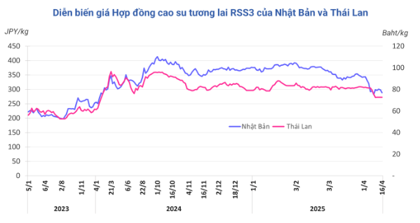 Kết thúc phiên giao dịch 16/4, tại Nhật Bản, giá cao su kỳ hạn tháng 4 giảm 3,5% (10,6 yên) về mức 288 yen/kg. Ở Trung Quốc, giá cao su kỳ hạn tháng 5 giảm 0,57% (85 nhân dân tệ) về mức 14.720 nhân dân tệ/tấn; trong khi tại Thái Lan, giá cao su kỳ hạn tháng 5 đi ngang mức 72,63 baht/kg khi hôm qua trùng vào ngày Tết Songkran.
