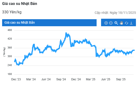 Kết thúc phiên giao dịch 18/11, tại Thái Lan, giá cao su kỳ hạn tháng 12/2025 tăng 0,7% (0,49 baht) lên mức 67,12 baht/kg. Tại thị trường Nhật Bản (OSE), giá cao su kỳ hạn tháng 12 tăng 0,4% (1,3 yen) lên mức 323,5 yen/kg. Tại Trung Quốc, giá cao su kỳ hạn tháng 1/2026 tăng 0,5% (75 nhân dân tệ) lên mức 15.320 nhân dân tệ/tấn.