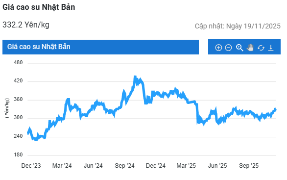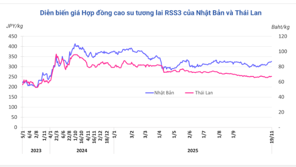 Kết thúc phiên giao dịch 19/11, tại Thái Lan, giá cao su kỳ hạn tháng 12/2025 tăng 0,1% (0,09 baht) lên mức 67,21 baht/kg. Tại thị trường Nhật Bản (OSE), giá cao su kỳ hạn tháng 12 tăng 0,8% (2,5 yen) lên mức 326 yen/kg. Tại Trung Quốc, giá cao su kỳ hạn tháng 1/2026 tăng 0,59% (90 nhân dân tệ) lên mức 15.410 nhân dân tệ/tấn.