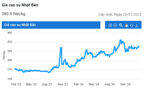 Đóng cửa phiên giao dịch ngày 20/1, giá cao su RSS3 giao tháng 3/2025 tại Sở Giao dịch Osaka (OSE) Nhật Bản ghi nhận 380.2 yen/kg, giảm 1.4% (5.4 yen/kg) so với cuối tuần trước.