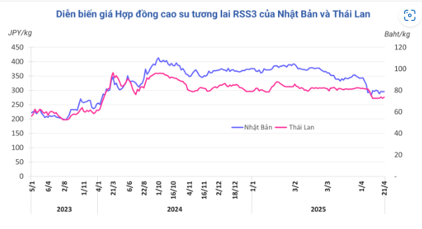 Kết thúc phiên giao dịch 21/4, tại Nhật Bản, giá cao su kỳ hạn tháng 4 tăng 0,2% (0,7 yên) lên mức 296 yen/kg. Ở Trung Quốc, giá cao su kỳ hạn tháng 5 giảm 0,07% (10 nhân dân tệ) về mức 14.705 nhân dân tệ/tấn; trong khi tại Thái Lan, giá cao su kỳ hạn tháng 5 tăng 1,4% (1,05 baht) lên mức 73,68 baht/kg.