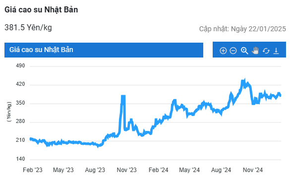 Đóng cửa phiên giao dịch ngày 22/1, giá cao su RSS3 giao tháng 3/2025 tại Sở Giao dịch Osaka (OSE) Nhật Bản ghi nhận 384.7 yen/kg, tăng 0,2% (0,9 yen/kg) so với hôm trước, giữ đà tăng hai ngày liên tiếp.