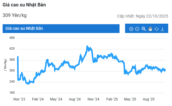 Kết thúc phiên giao dịch 22/10, tại Thái Lan, giá cao su kỳ hạn tháng 11 giảm 0,4% (0,27 baht) về mức 66,21 baht/kg. Tại thị trường Nhật Bản (OSE), giá cao su giảm 1,1% (3,2 yen) xuống mức 299,8 yen/kg. Tại Trung Quốc, giá cao su tăng 0,9% (125 nhân dân tệ) lên mức 14.385 nhân dân tệ/tấn.