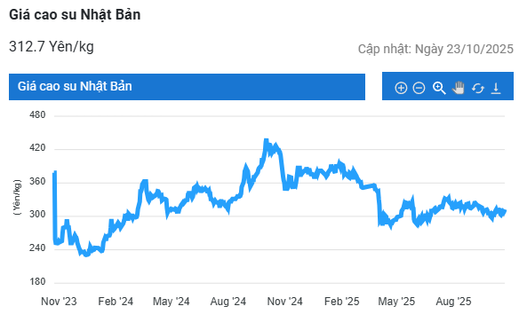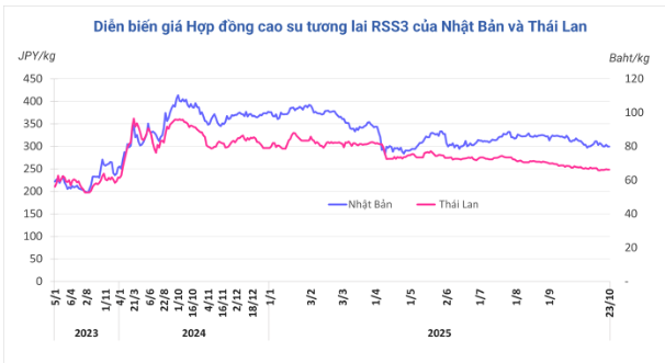 Kết thúc phiên giao dịch 23/10, tại Thái Lan, giá cao su kỳ hạn tháng 11 bình ổn ở mức 66,21 baht/kg. Tại thị trường Nhật Bản (OSE), giá cao su cũng đi ngang mức 299,8 yen/kg. Tại Trung Quốc, giá cao su tăng 0,7% (105 nhân dân tệ) lên mức 14.490 nhân dân tệ/tấn.