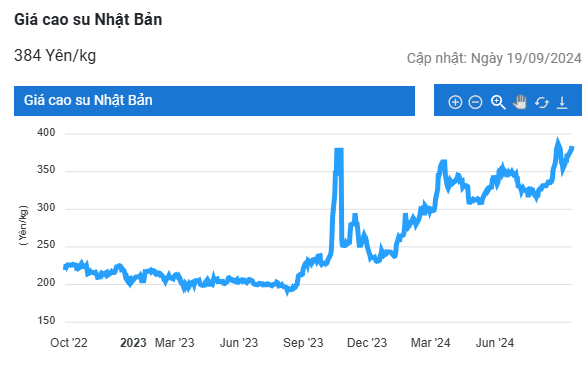 Cụ thể, giá cao su giao tháng 10 trên sàn giao dịch Osaka (OSE) Nhật Bản tăng 1,7 % so với hôm qua, lên mức 393 yên/kg; Hợp đồng giao tháng 2/2025 cũng tăng 1,7% lên 385 yen/kg. Đây là mức giá cao nhất đạt được trong nhiều năm qua.
