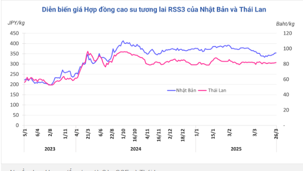 Kết thúc phiên giao dịch 26/3, tại Trung Quốc, giá cao su kỳ hạn tháng 4 trên Sàn Thượng Hải giảm 0,61% (105 nhân dân tệ) về mức 16.985 nhân dân tệ/kg. Tại Thái Lan, giá cao su kỳ hạn tháng 4 tăng 0,5% lên mức 81,83 baht/kg, Nhật Bản tăng 0,3% (1,1 yen) lên mức 353,8 yen/kg.