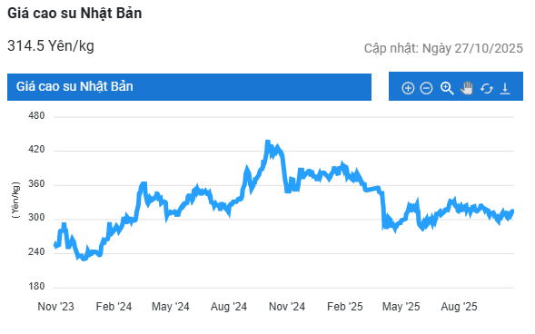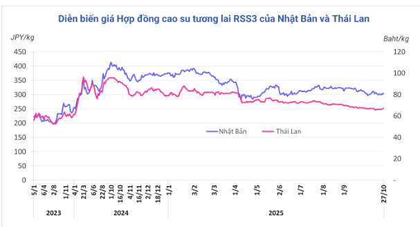 Kết thúc phiên giao dịch 27/10, tại Thái Lan, giá cao su kỳ hạn tháng 11 tăng 0,2% (0,12 baht) lên mức 67,06 baht/kg. Tại thị trường Nhật Bản (OSE), giá cao su kỳ hạn tháng 11 giảm 0,9% (2,6 yên) về mức 302,3 yen/kg. Tại Trung Quốc, giá cao su giảm 0,1% (15 nhân dân tệ) về mức 14.580 nhân dân tệ/tấn.