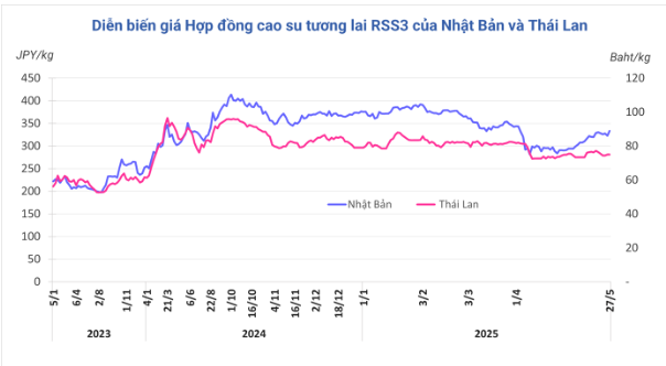 Kết thúc phiên giao dịch 27/5, tại Trung Quốc, giá cao su kỳ hạn tháng 6 trên Sàn Thượng Hải tăng 0,2% (25 nhân dân tệ) lên mức 14.335 nhân dân tệ/tấn. Tương tự, giá cao su kỳ hạn tháng 6 trên Sàn OSE ở Nhật Bản tăng mạnh 3,2% (10,2 yen/kg) lên mức 333,2 yen/kg, ghi nhận mức tăng lớn nhất kể từ ngày 10/4 và mức giá cao nhất từ ngày 2/4. Tại Thái Lan, giá cao su kỳ hạn tháng 6 đi ngang mức 74,95 baht/kg.