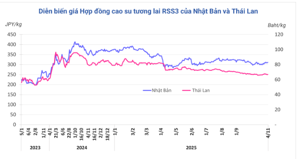 Kết thúc phiên giao dịch 4/11, tại Thái Lan, giá cao su kỳ hạn tháng 12/2025 tăng 0,5% (0,32 baht) lên mức 66,95 baht/kg. Tại thị trường Nhật Bản (OSE), giá cao su kỳ hạn tháng 12 tăng 0,6% (1,9 yen) lên mức 310,9 yen/kg. Tại Trung Quốc, giá cao su kỳ hạn tháng 1/2026 giảm 0,86% (130 nhân dân tệ) về mức 14.960 nhân dân tệ/tấn.