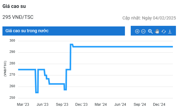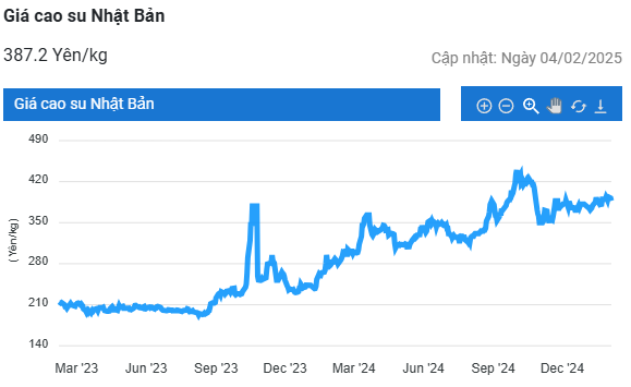 Đóng cửa phiên giao dịch 4/2, giá cao su RSS3 giao tháng 3/2025 tại Sở Giao dịch Osaka (OSE) Nhật Bản giảm tiếp 1,6% (6,2 yen/kg) về mức 384,3 yen/kg.