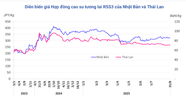 Kết thúc phiên giao dịch 21/8, tại Trung Quốc, giá cao su kỳ hạn tháng 9 trên Sàn Thượng Hải (SHFE) tăng 0,89% (130 nhân dân tệ) lên mức 14.780 nhân dân tệ/tấn. Tại Thái Lan, giá cao su kỳ hạn tháng 9 đi ngang 70,9 baht/kg. Tại thị trường Nhật Bản (OSE), giá cao su tăng 0,8% (2,6 yên) lên mức 323,8 yen/kg.