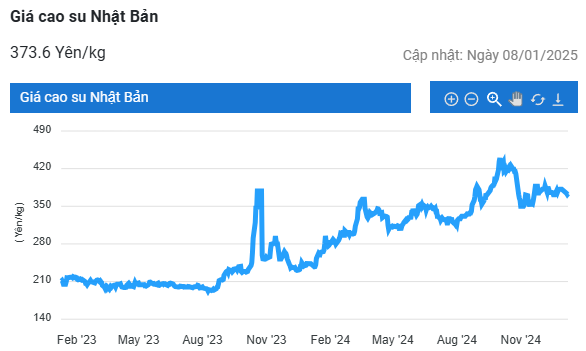 Ghi nhận trong phiên giao dịch ngày 9/1, giá cao su RSS 3 giao tháng 3/2025 tại Sở Giao dịch Osaka (OSE) Nhật Bản đạt 365,9 yen/kg, tăng 0,9% (3,1 yen/kg) so với phiên giao dịch trước.