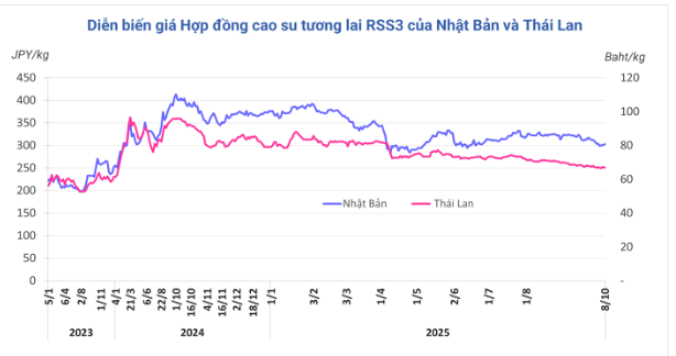 Kết thúc phiên giao dịch 8/10, tại Thái Lan, giá cao su kỳ hạn tháng 10 giảm 0,7% (0,45 baht) về mức 66,92 baht/kg. Tại thị trường Nhật Bản (OSE), giá cao su tăng 0,8% (2,5 yên) lên mức 302,8 yen/kg.