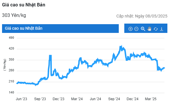Kết thúc phiên giao dịch 8/5, tại Trung Quốc, giá cao su kỳ hạn tháng 5 trên Sàn Thượng Hải giảm 1,5% (220 nhân dân tệ) về mức 14.475 nhân dân tệ/tấn. Trong khi đó, Nhật Bản tăng 1,3% (3,8 yen/kg) lên mức 302,7 yen/kg.