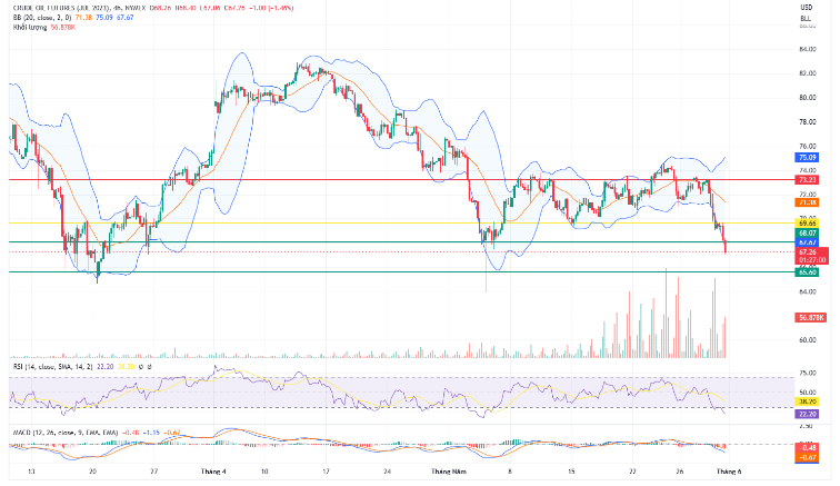 Về mặt kỹ thuật trên khung H4, giá đã phá vỡ vùng hỗ trợ 68 USD và đang chạm cạnh dưới của dải Bollinger Band, chỉ số RSI đã rơi vào vùng quá bán. Tuy nhiên với việc không có thông tin hỗ trợ trên thị trường, dự đoán giá có thể tiếp tục giảm xuống vùng 65,6 USD/thùng trước thời điểm diễn ra cuộc họp tại Mỹ.
