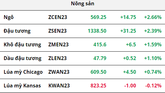 Phe mua chiếm ưu thế áp đảo trên thị trường nông sản trong đầu phiên tối. Giá ngô và giá đậu tương tiếp tục tăng mạnh nhờ lực mua kỹ thuật của thị trường. Bên cạnh đó, giá khô đậu tương và giá lúa mì cũng đảo chiều tăng trở lại và xóa đi hoàn toàn mức giảm từ đầu phiên.