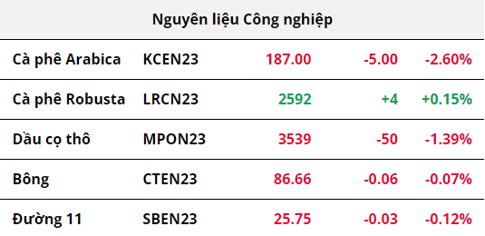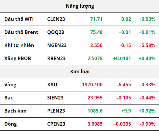 Trên thị trường năng lượng, giá của 2 mặt hàng dầu thô gần như không đổi khi những phát biểu cho thấy tin hiệu “diều hâu” từ các quan chức của Fed gây áp lực lên mức tăng do thiếu hụt nguồn cung từ Mỹ. Cụ thể, Chủ tịch Fed bang Minneapolis, ông Neel Kashkari cho rằng lãi suất có thể sẽ vượt quá 6% mới có thể đưa lạm phát trở về mục tiêu 2%, trong khi đó, Chủ tịch Fed bang St. Louis, ông James Bullard cho rằng cần thêm 2 đợt tăng 25 điểm cơ bản nữa trong năm 2023, những tín hiệu “diều hâu” sẽ khiến dòng tiền chảy về đồng USD khiến chi phí mua dầu thô trở nên đắt đỏ hơn. Về phía nguồn cung, 11 giàn khoan tại Mỹ đã dừng hoạt động, khiến tổng số giàn khoan xuống mức thấp nhất trong vòng 1 năm chỉ còn 575 giàn, theo báo cáo của Baker Hughes vào ngày 20/05 làm giá dầu tăng mạnh vào đầu phiên.