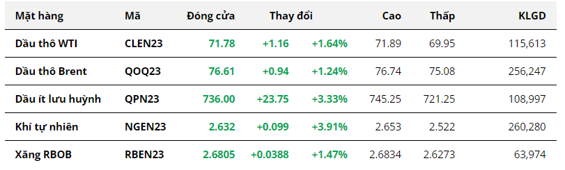 Giá dầu WTI tăng 1,64% lên mức 71,78 USD/thùng, dầu Brent tăng 1,24% lên mức 76,61 USD/thùng.