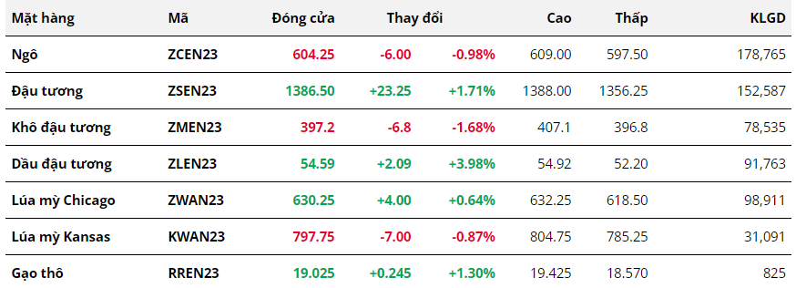 Dầu đậu tương tiếp tục là mặt hàng tăng mạnh nhất nhóm nông sản trong phiên hôm qua do lo ngại dòng chảy dầu hướng dương từ Biển Đen sẽ bị gián đoạn. Việc đập Kakhovka ở miền Nam Ukraine bị phá hủy đã khiến cho các khu vực sông Dnipro không thể đi lại, ảnh hưởng đến tuyến đường xuất khẩu ngũ cốc quan trọng của Kiev. Cục Quản lý Vận tải Nhà nước Ukraine cho biết, cửa ngõ xuất khẩu của Ukraine đã bị chặn. Trong khi đó, hiện tượng El Nino xuất hiện trong năm nay cũng gây ra ảnh hưởng tiêu cực tới mùa vụ dầu cọ của Indonesia và Malaysia, từ đó gây ra lo ngại về nguồn cung dầu thực vật toàn cầu.