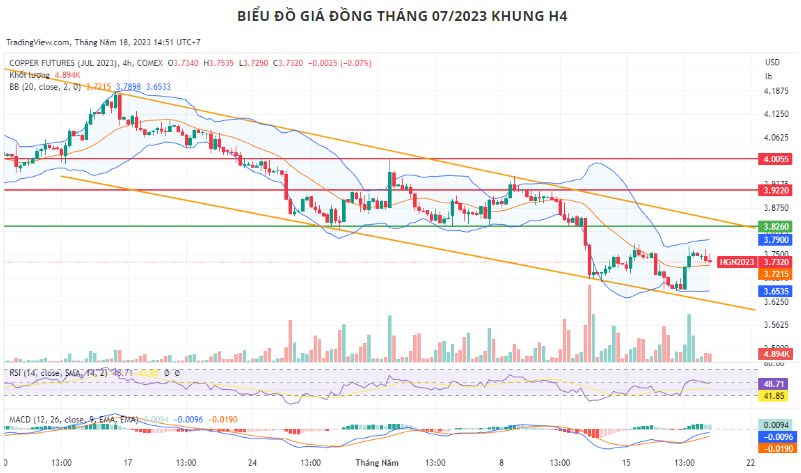 RSI ổn định ở mức 50% cho thấy phe mua chiếm ưu thế. Nếu dữ liệu của Mỹ công bố tối nay tích cực hơn dự báo, giá có thể tăng lên cạnh trên của dải Bollinger ở mức 3,79 USD. Ngược lại, số liệu tiêu cực có thể khiến giá giảm về cạnh dưới ở mức 3,65 USD.